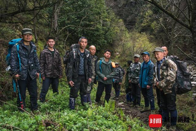 钟俊德(左三)和几位曾经的猎人一起,如今已是巡山护林队队员,他们和唐家河国家级自然保护区、桃花源老河沟保护地的工作人员一起进行联合巡护。
