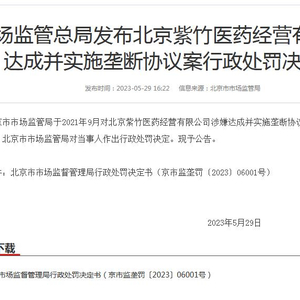 中新经纬6月1日电 据“北京市场监管”微信公众号消息,近日,北京市市场监督管理局查处北京紫竹医药经营有限公司达成并实施垄断协议案。