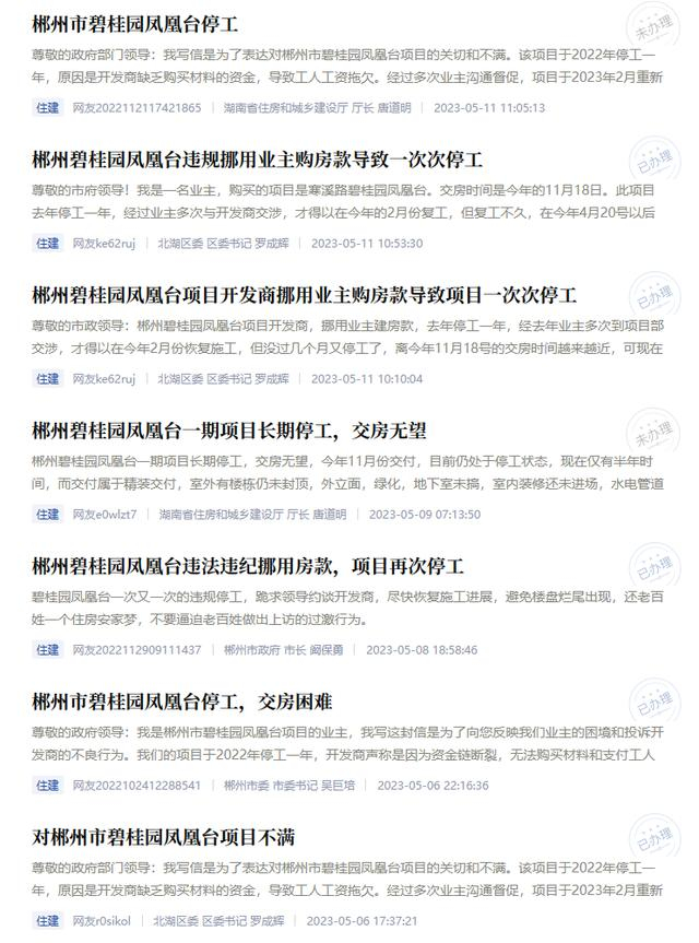 除了碧桂园凤凰台项目,在问政湖南网站,近期还有业主反映“宁远县碧桂园凤凰城停工一年””浏阳市碧桂园云顶已过交房期项目仍处于停工状态”等问题。