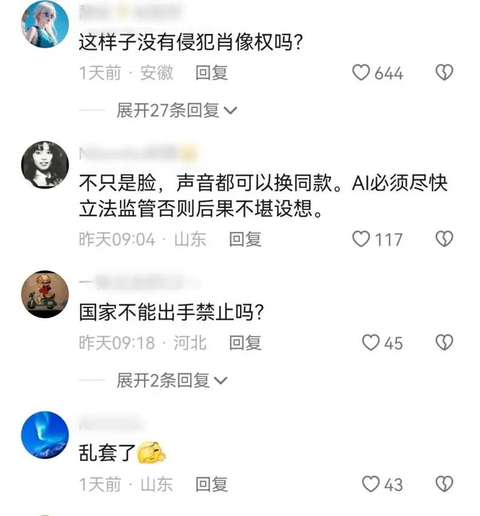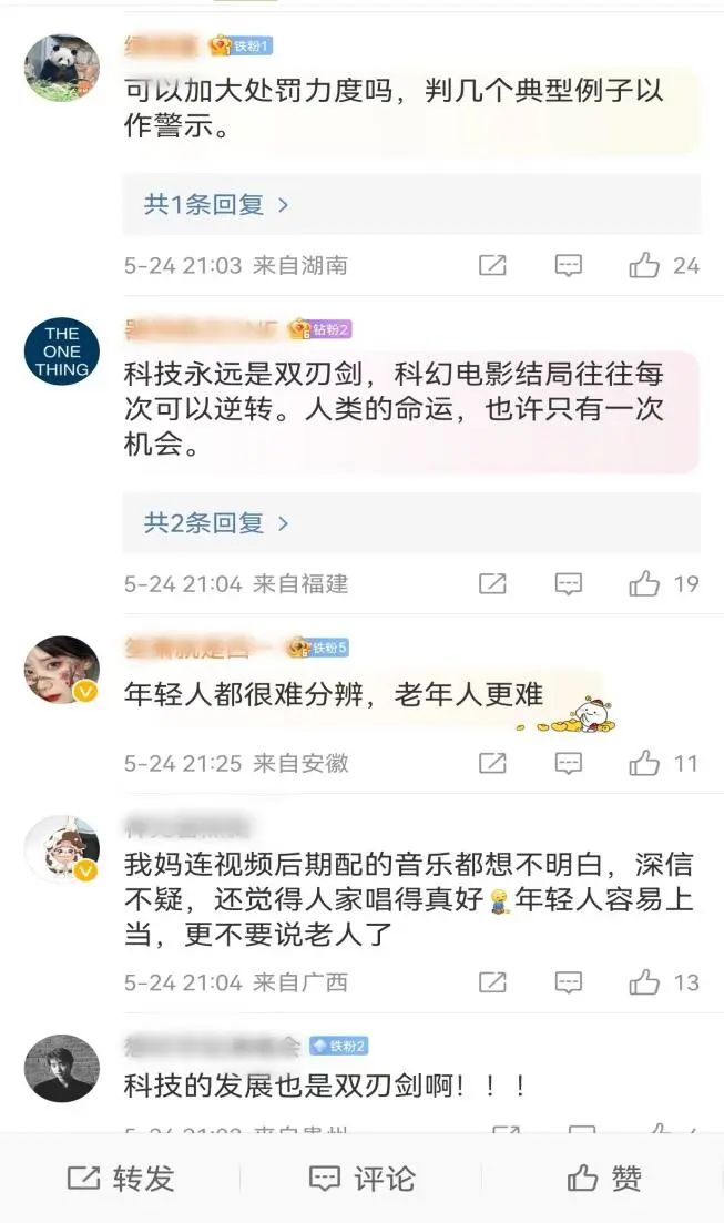 有网友认为,AI换脸技术主要问题在于肖像权的使用;有的则认为,需要提高警惕,学习如何鉴别“AI假脸”;从网友的留言可以看出,AI技术是一把双刃剑,AI换脸技术带来的风险也令大众担忧。