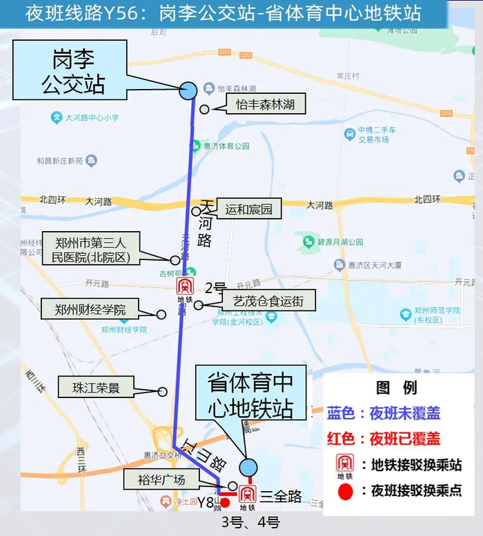 服务范围:填补天河路、江山路夜班线路空白;服务怡丰森林湖、碧桂园天澜、运和宸园、郑州市第三人民医院、郑州财经学院、锦艺四季城、珠江荣景等沿途居民前往艺茂仓食运街、裕华广场商圈夜间出行需求;该线路可与地铁2号线、3号线、4号线、与夜班线路Y8路接驳。