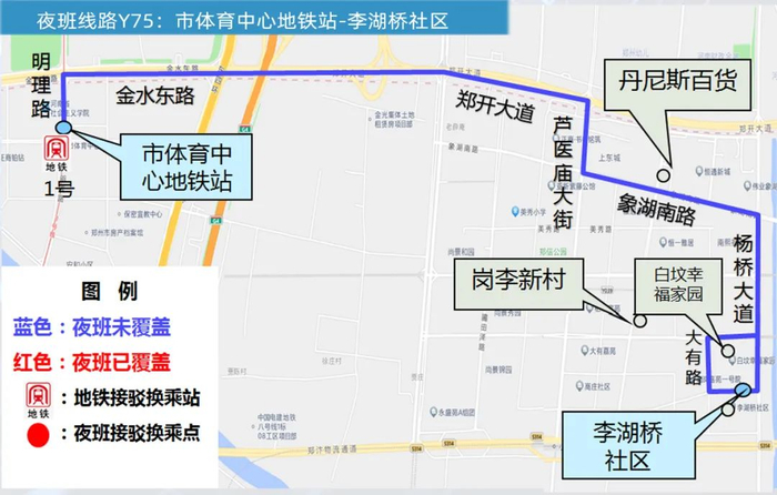 服务范围:填补明理路、金水东路、郑开大道、芦医庙大街、象湖南路、杨桥大道、恭秀路、大有路、良秀路夜班线路空白;服务李湖桥社区、白坟幸福家园、岗李新村等沿途居民前往丹尼斯百货出行需求;该线路可与地铁1号线接驳。