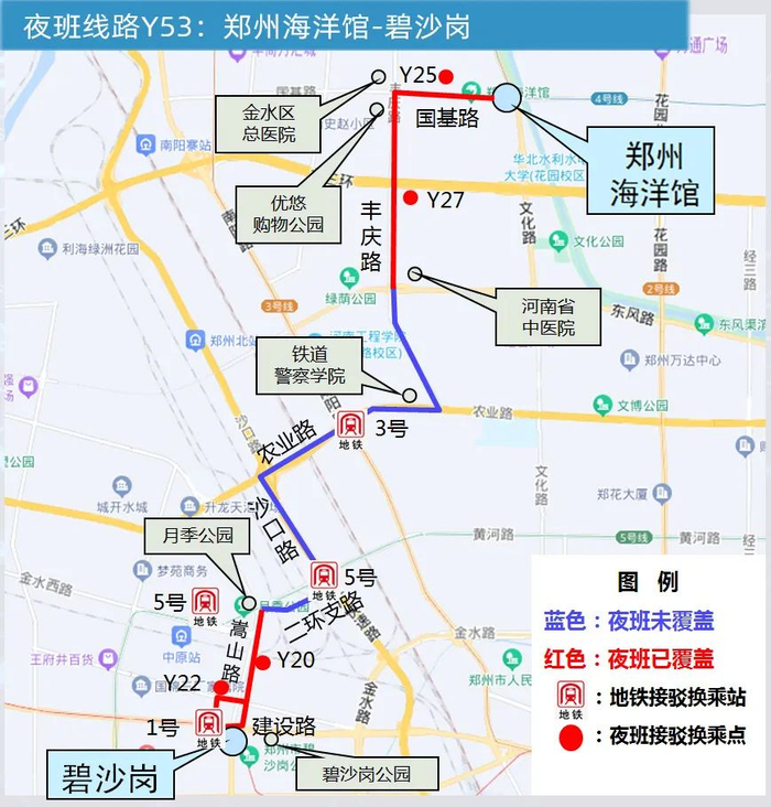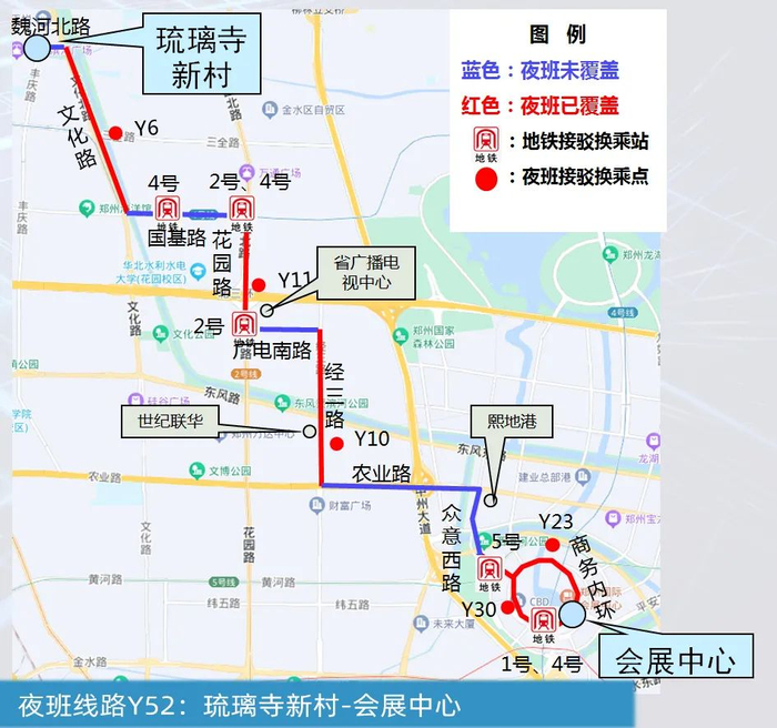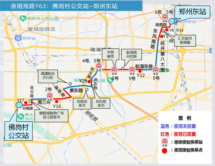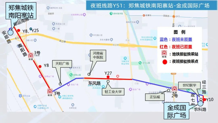 服务范围:填补冉屯东路、农业路部分路段夜班线路空白;服务开元新城、风和日丽家园社区、河南农业大学、铁道警察学院等沿途居民前往天明路夜市、国贸360、丹尼斯百货、熙地港购物中心以及郑州颐和医院、河南省儿童医院的出行需求;该线路可与地铁1、3、4、5号线、Y20、Y23、Y27、Y1、Y9接驳。