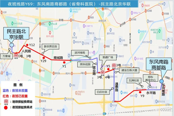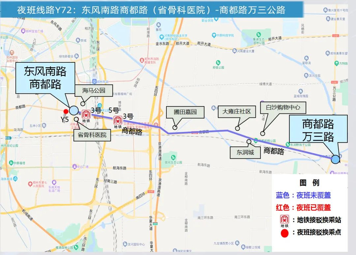 服务范围:填补商都路东段夜班线路空白;服务海马公园、圃田嘉园、东润华景、东润城等沿途居民前往郑东商业中心、白沙购物中心商圈出行;该线路与地铁3号、5号线、夜班线路Y5路接驳。