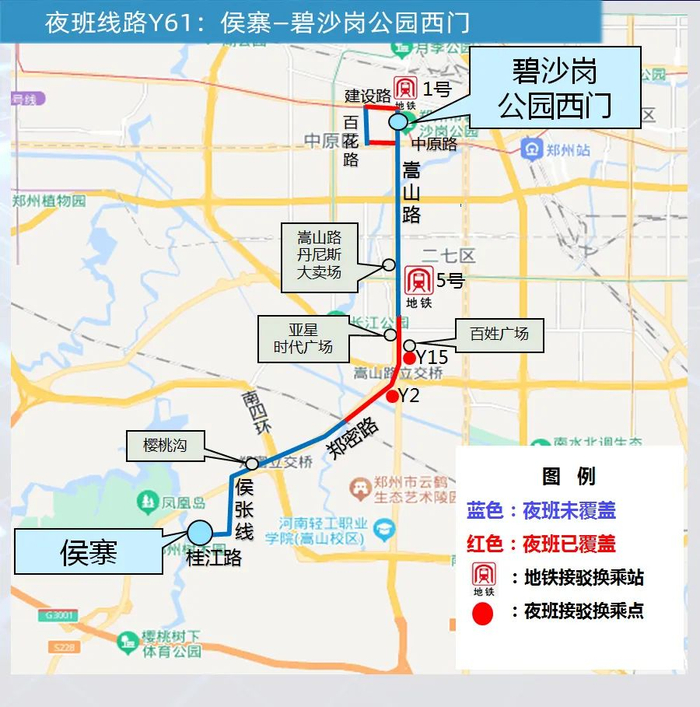 服务范围:填补桂江路、侯张线、郑密路、嵩山路、百花路夜班线路空白;服务侯寨、绿地城社区、亚星盛世社区、升龙城社区等沿途居民前往百姓广场、嵩山路丹尼斯大卖场商圈、碧沙岗公园、亚星时代广场夜市出行;该线路可与地铁1号线、5号线、夜班线路Y2路、Y15路接驳。