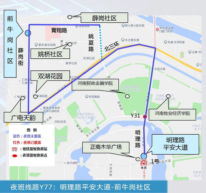 服务范围:填补明理路、北三环、姚夏路、育翔路、薛岗街夜班线路空白;服务薛岗社区、姚桥社区、广电天韵、河南财政金融学院、河南牧业经济学院等沿途乘客前往正商木华广场出行需求;该线路可与地铁1号线、夜班线路Y31路接驳。