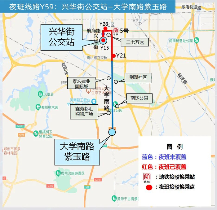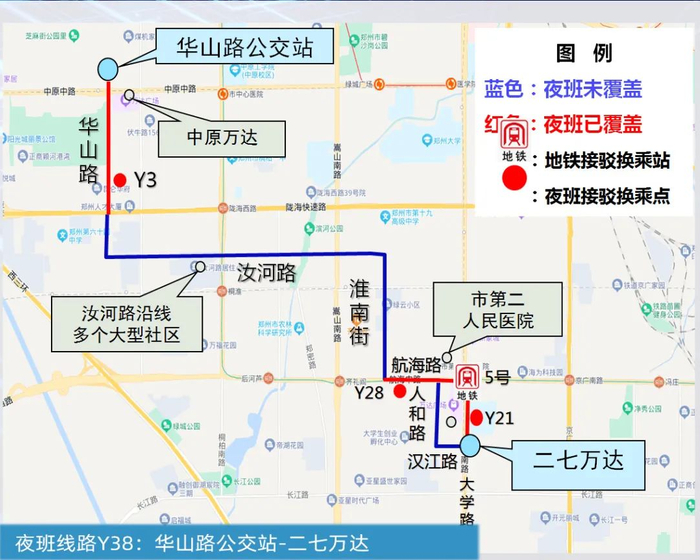 服务范围:填补大学南路夜班线路空白;服务万科大都会社区、泰宏建业城社区、鑫苑鑫家社区、郑州航空工业管理学院等沿途居民前往二七万达商圈、鑫苑都汇购物广场、南环公园、第二人民医院、荆胡夜市出行;该线路可与地铁5号线、夜班线路Y15、Y21路、Y28路接驳。