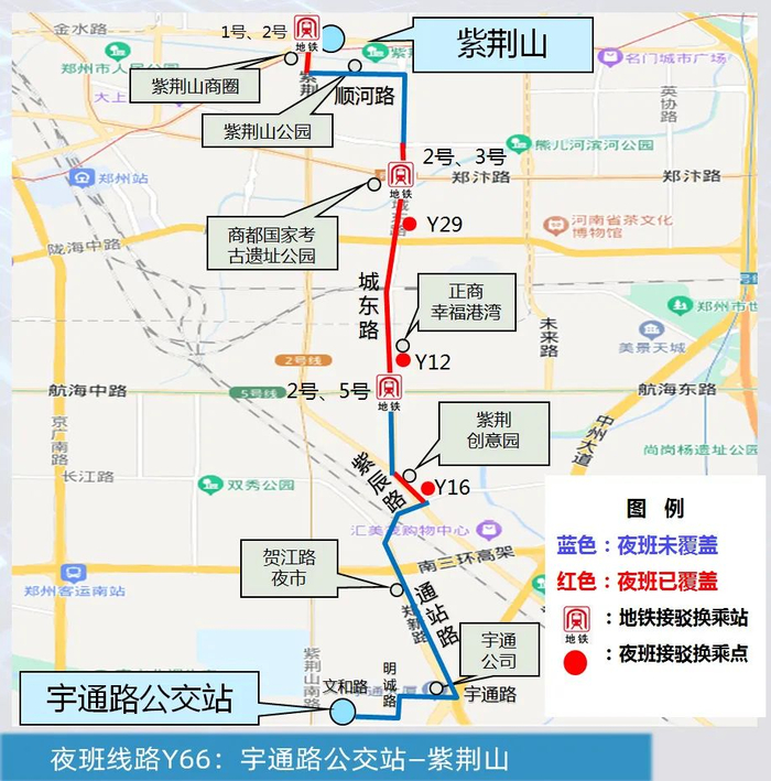 服务范围:填补文和路、明诚路、宇通路、通站路、城东路、顺河路夜班线路空白;服务绿都澜湾社区、永威城社区、正商幸福港湾等社区沿途居民前往商都国家考古遗址公园、紫荆山公园、紫荆山商圈、宇通公司、紫荆创意园出行服务;该线路可与地铁1、2、3、5号线、夜班线路Y12路、Y13路、Y16路、Y29路、Y31路接驳。