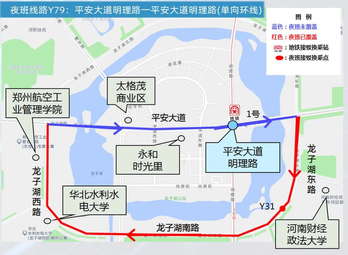 服务范围:填补平安大道夜班线路空白;服务郑州航空工业管理学院、华北水利水电大学、河南财经政法大学等沿途居民前往永和时光里、太格茂出行需求;该线路可与地铁1号线、夜班线路Y31路接驳。