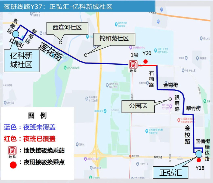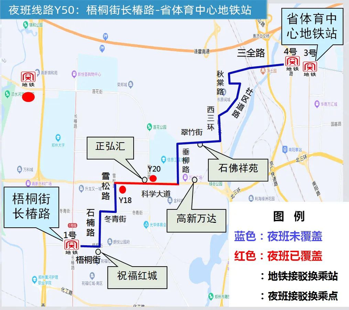 服务范围:填补梧桐街、石楠路、冬青街、雪松路、垂柳路、翠竹街、西三环、欢河家园、秋棠路、三全路夜班线路空白;服务祝福红城、秦庄嘉园、石佛祥苑、河南省国家大学科技园、信息工程大学等沿途居民前往正弘汇、高新万达的夜间出行需求;该线路可与地铁1号线、3号线、4号线、夜班线路Y18、Y20接驳。