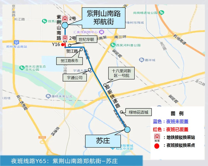 服务范围:填补紫荆山南路、贺江路、通站路、郑新快速路夜班线路空白;服务绿都紫荆华庭社区、永威城社区、十八里河新区一号院、绿地花语城、鑫苑城十里铺社区等沿途居民前往世纪联华超市、宇通公司、贺江路夜市出行;该线可与地铁2号线、夜班线路Y16接驳。