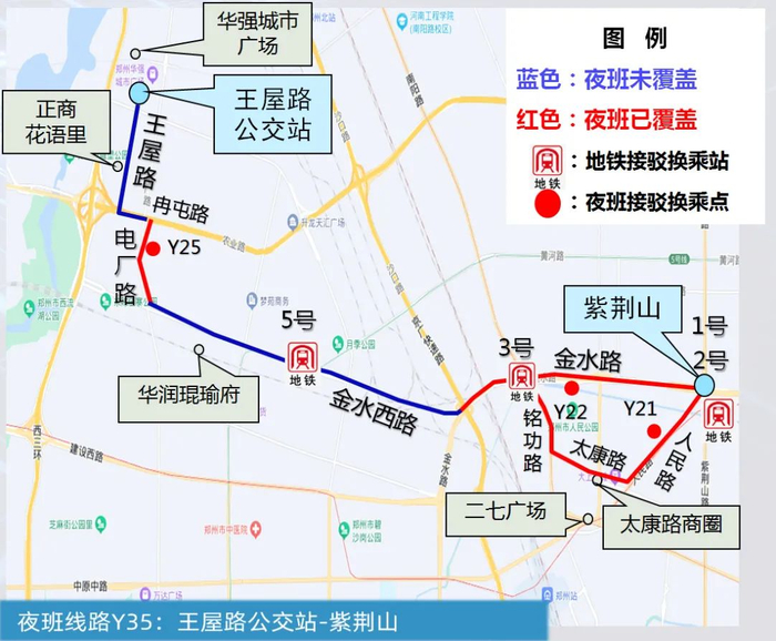 服务范围:填补王屋路、冉屯路、金水西路夜班线路空白;服务西湖新城、正商花语里、华润琨瑜府社区、风、日丽家园社区等沿途居民前往紫荆山商圈、太康路商圈、二七广场商圈的出行需求;该线路可与地铁1、2、3、5号线、Y25、Y21、Y22接驳。
