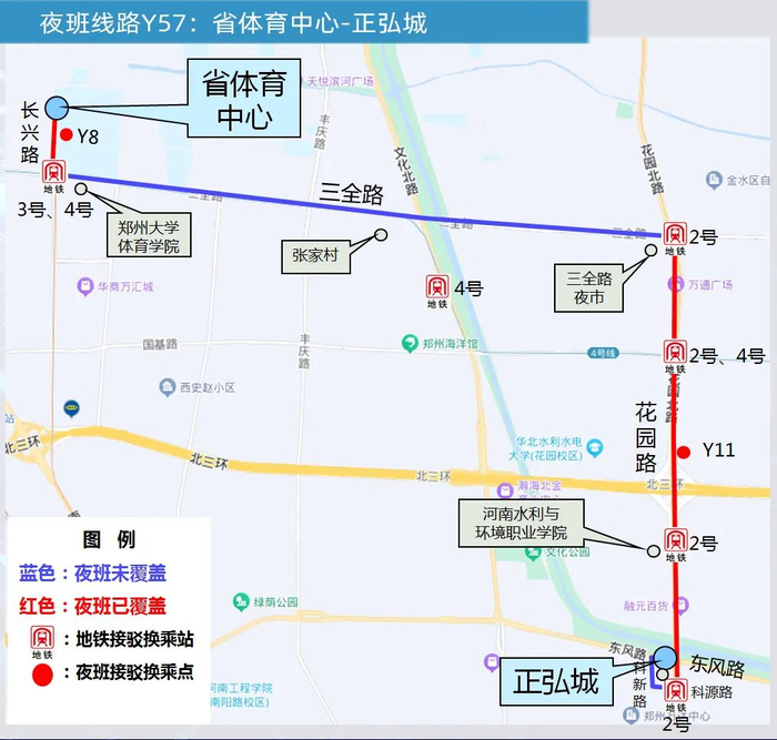 服务范围:填补三全路、科新路、东风路夜班线路空白;服务郑州大学体育学院、国瑞静香园、张家村、东岸尚景、二十一世纪社区、河南水利与环境职业学院等沿途居民前往正弘城商圈、三全路夜市出行需求;该线路可与地铁2号线、3号线、4号线、夜班线路Y8路、Y11路接驳。