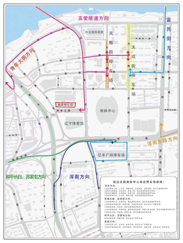 ①途经青年大街、三义街、南堤中路、天坛南街、浑南五路、抵达大奥莱停车场及辽宁体育馆停车场;