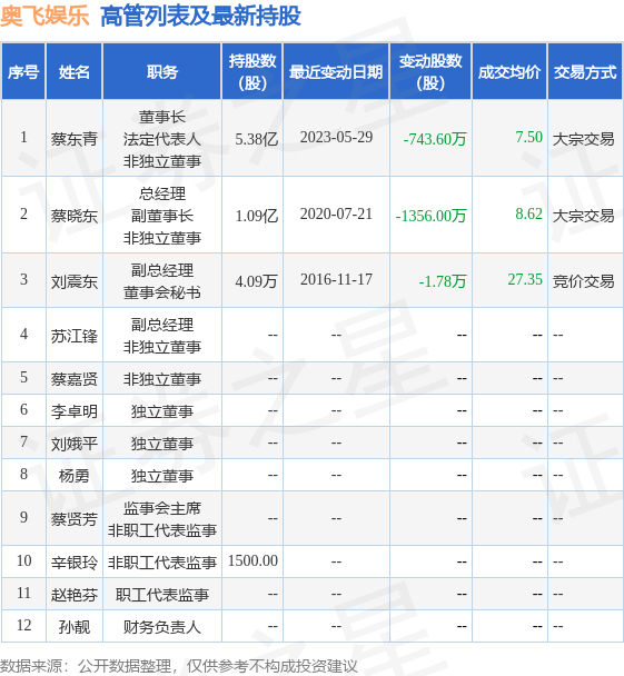 奥飞娱乐的高管列表及最新持股情况如下: