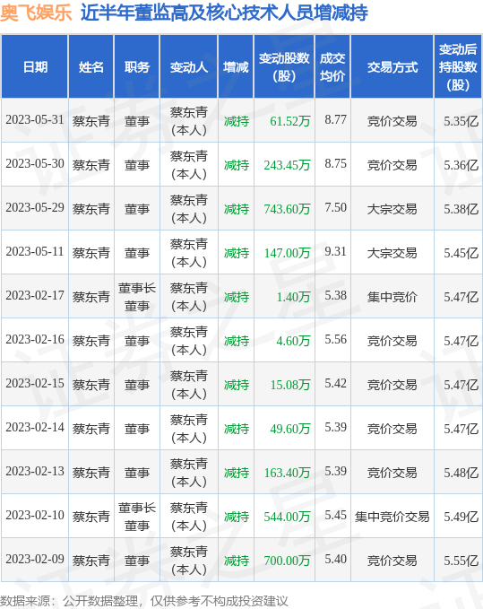 奥飞娱乐:5月31日公司高管蔡东青减持公司股份合计61.52万股