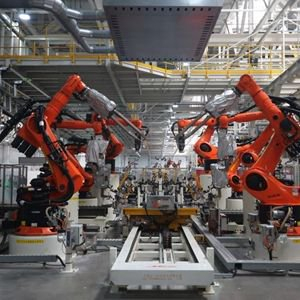 黄色的机械臂上下挥舞,无人搬运车穿梭不停,焊装线火花四溅,配备了高精度传感器和先进机器视觉系统的焊接机器人正在精准焊接车身部件……