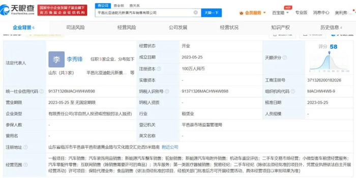 天眼查显示,2023年5月25日,平邑比亚迪乾元新景汽车销售有限公司成立,法定代表人李秀锋,注册资本100万元,经营范围包括:汽车销售、新能源汽车整车销售、新能源汽车电附件销售等。