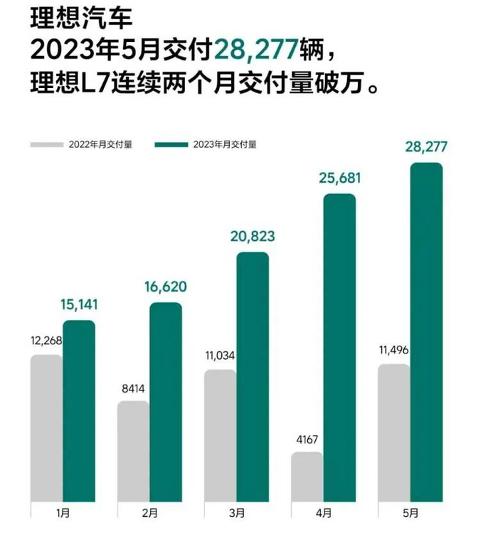对比国内造车新势力看,2023年5月交付量中,蔚来汽车6155辆、小鹏汽车7506辆、理想汽车2.83万辆。