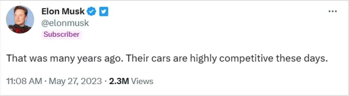 近日,马斯克在推特上,回应一位网友发布的旧视频片段称:“那是很多年前的事了,他们的车现在竞争力很强。”