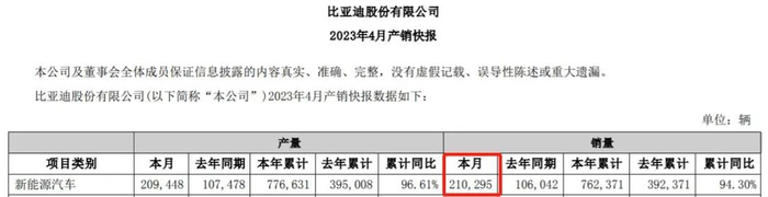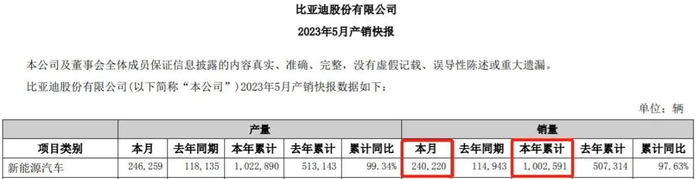 同时,2023年前5个月,比亚迪新能源汽车销量突破100万辆,超过2022年全年销量(186.35万辆)的一半。