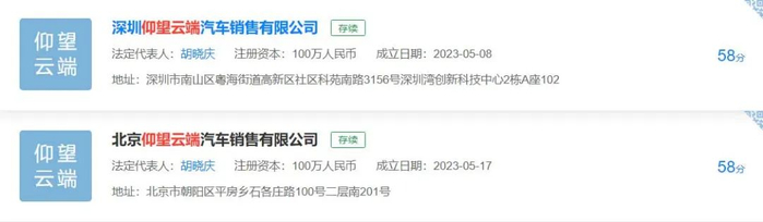 其中,比亚迪在北京、深圳,相继成立了北京仰望云端汽车销售有限公司、深圳仰望云端汽车销售有限公司,许可经营项目包含新能源汽车整车销售、汽车销售等。