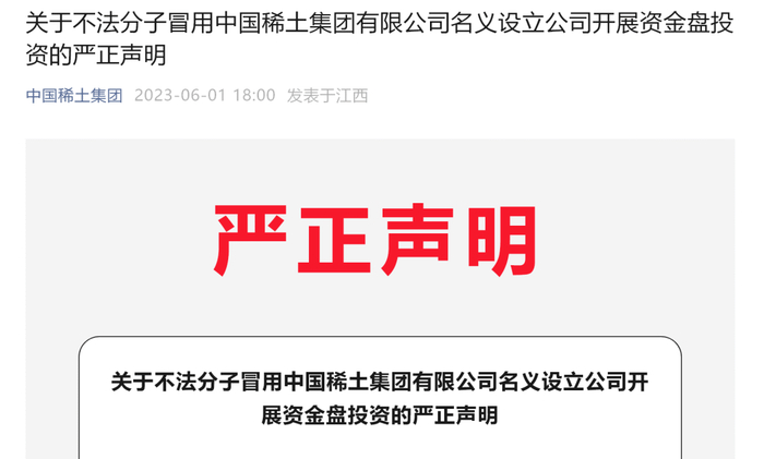 中国稀土集团微信号6月1日发布“关于不法分子冒用中国稀土集团有限公司名义设立公司开展资金盘投资的严正声明”