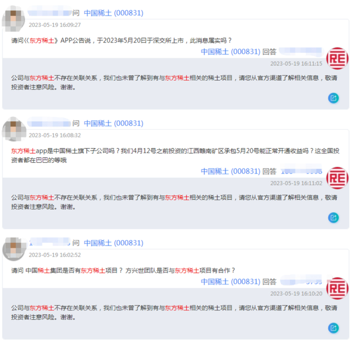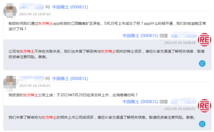 如一位投资者提问,自己投资的东方稀土公告上说:于2023年5月20日在深交所上市,此消息确切吗?还有投资者问:“前段时间我们通过东方稀土app投资的江西赣南矿区承包,5月20号上市成功了吧?app什么时候开通,我们的收益能正常进行了吗?”