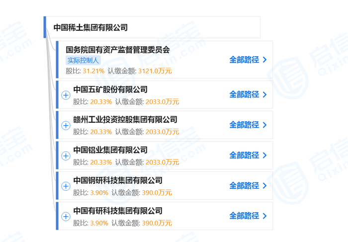 官网显示,中国稀土旗下有中国稀有稀土股份有限公司、五矿稀土集团有限公司、中国南方稀土集团有限公司等三家骨干企业,业务范围涵盖稀土科技研发、勘探开发、冶炼分离、精深加工、下游应用、成套装备、技术咨询服务、进出口及贸易等领域,具备稀土全产业链发展能力。