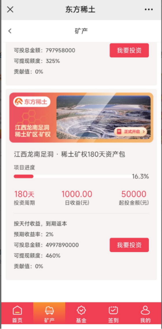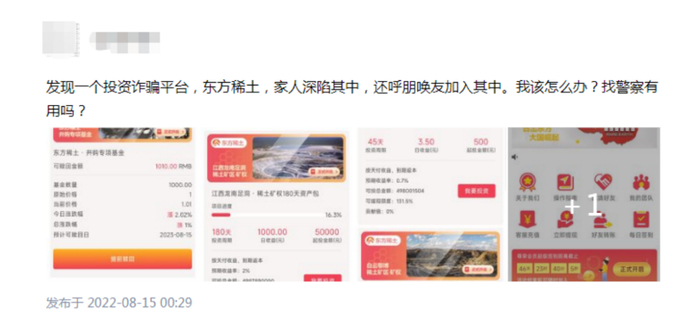 此外,曾有网友在去年发文,称“东方稀土”系投资诈骗平台,家人却深陷其中。从其提供的截图信息来看,彼时该平台便设有多个稀土相关投资项目,其中一个名为“江西龙南足洞稀土矿权180天资产包”的项目,显示“按天付收益,到期返本”。该项目投资周期180天,起投金额5万元,日收益竟显示有1000元。