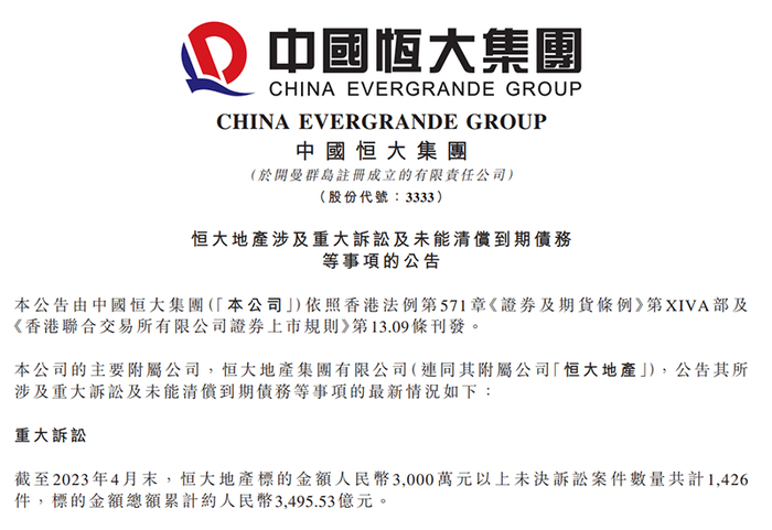 6月1日深夜,中国恒大发布恒大地产涉及重大诉讼及未能清偿到期债务等事项的公告称,截至2023年4月末,恒大地产标的金额人民币3000万元以上未决诉讼案件数量共计1426件,标的金额总额累计约3495.53亿元。截至2023年4月末,恒大地产涉及未能清偿的到期债务(不含境内外债券)累计约2724.79亿元;此外,截至2023年4月末,恒大地产逾期商票累计约2459.87亿元。