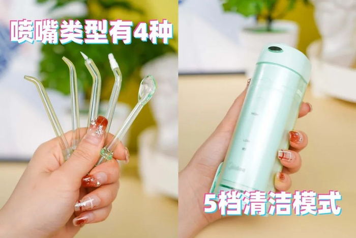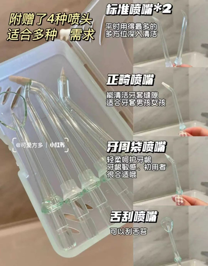 5个喷嘴,无论是男女老少还是正畸牙齿,都能选到合适的喷头,用它来清洁口腔。