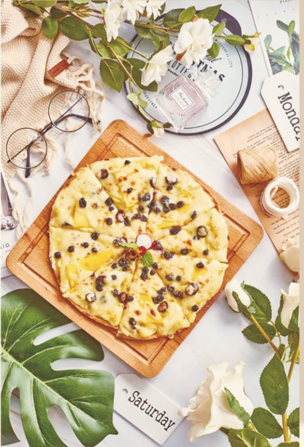 榴莲蓝莓薄饼。将新鲜的榴莲果肉和蓝莓、芒果组合,配上现烤的薄脆饼,轻咬一口就停不下来。