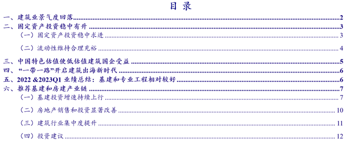 “中特估”及“一带一路”的催化将使建筑企业受益。截至5月31日,建筑指数动态PE/PB分别为9.83/0.91倍,在过去10年的历史分位点为15.98%/27.49%,建筑行业估值处于历史中低位水平,有望受益于中国特色估值体系(简称“中特估”)的构建和“一带一路”主题的催化。基建是稳增长抓手,房地产预计将进一步回暖。推荐中国铁建(601186)、中国建筑(601668)、中国中铁(601390)、中国交建(601800)、中国电建(601669)、中国能建(601868)、中国中冶(601618)、中国化学(601117)等。建议关注四川路桥(600039)、山东路桥(000498)、安徽建工(600502)、上海建工(600170)、华设集团(603018)、浙江交科(002061)、设计总院(603357)等。