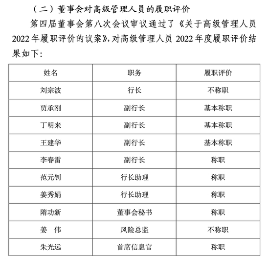 记者注意到,青岛农商银行原行长刘宗波、原风险总监姜伟均被给予“不称职”评价。
