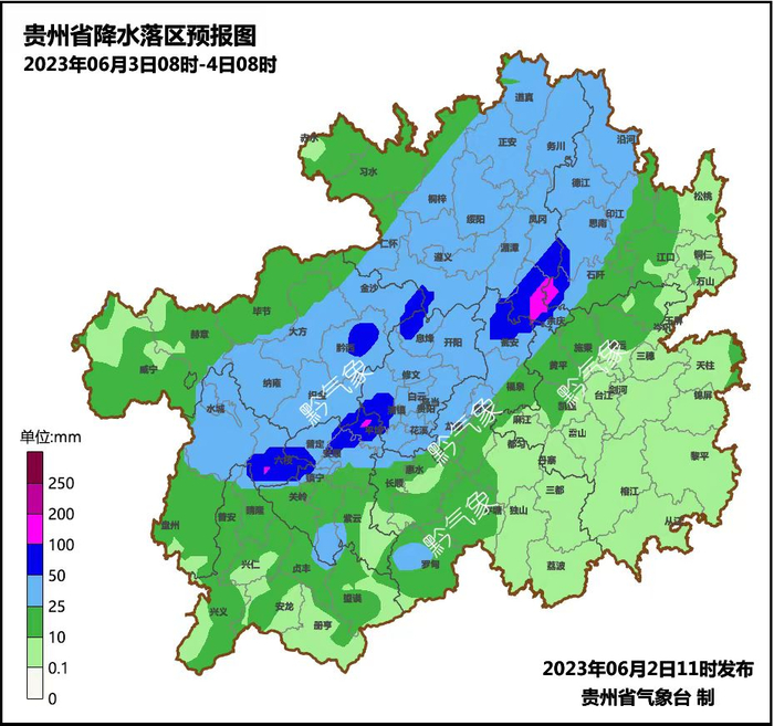 6月2日(周五)傍晚至6月3日(周六),全省各地阴天间多云有阵雨或雷雨,毕节市中南部、六盘水市东部、安顺市北部、贵阳市西部北部、遵义市中东部、铜仁市西部有中到大雨,局地暴雨,部分乡镇大暴雨,局地伴有大风、冰雹等强对流天气。