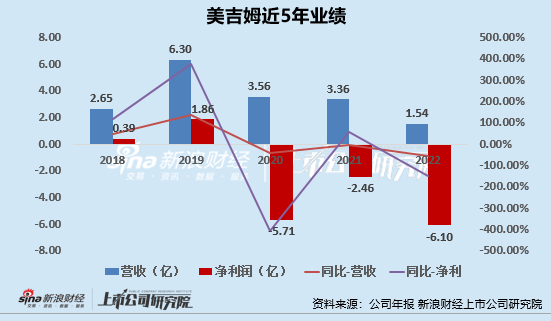 2022年,美吉姆延续业绩颓势,共实现营收1.54亿元,同比下降54.26%;净利润亏损6.1亿元,同比下降147.81%。至此,美吉姆已连续三年净利润亏损,2020-2022年分别亏损5.71亿元、2.46亿元、6.1亿元,合计亏损金额超过14亿元。