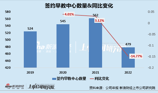 2019-2021年,公司签约早教中心的数量保持相对稳定,分别为524家、545家、562家。然而,2022年美吉姆签约早教中心数量大幅下降,由2021年562家下降至479家,减少了83家,其中不乏因经营不善闭店的早教中心。