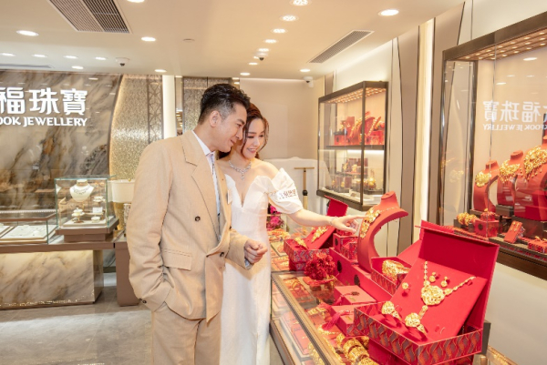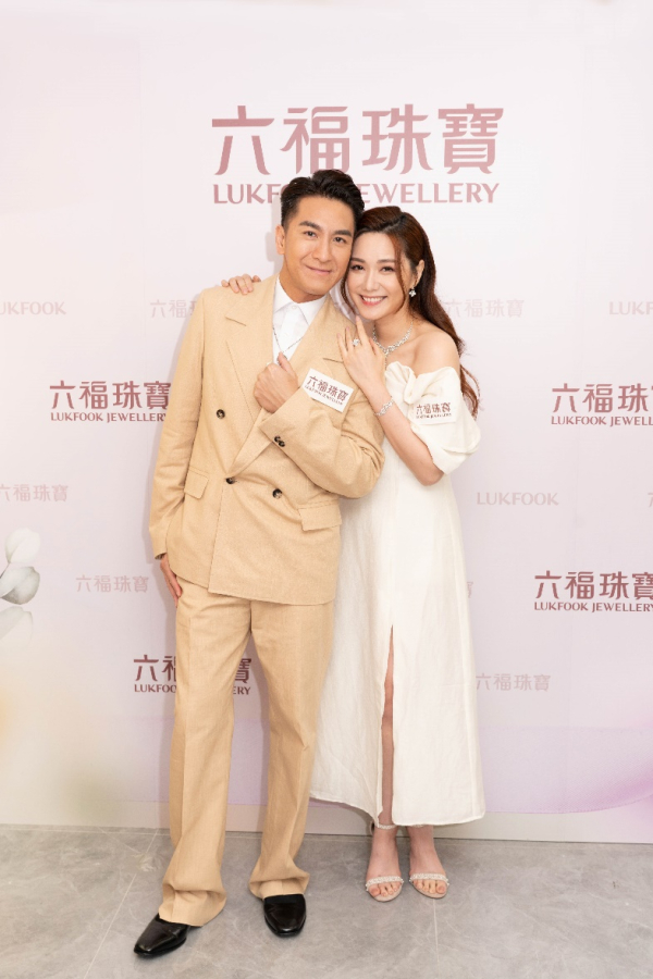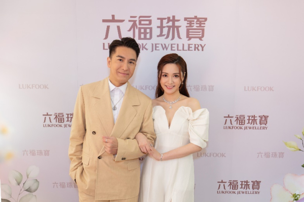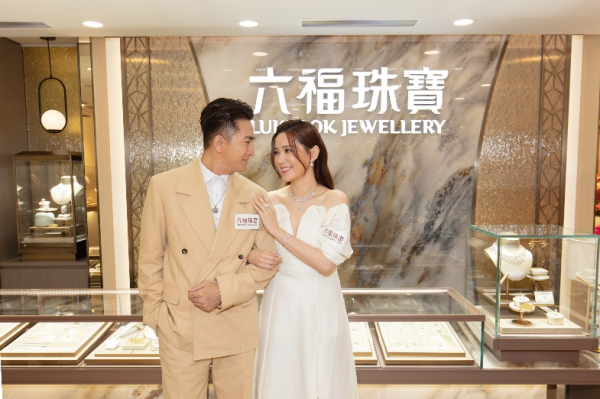 视帝马国明先生与汤洛雯小姐欣赏六福珠宝婚嫁系列的珠宝作品。