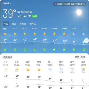 6月1日上午10时55分,攀枝花市气象台继续发布东区、西区高温红色预警信号:东区城区、银江镇,西区城区、格里坪镇等乡镇(街道)未来24小时内最高气温将升至40℃以上。请注意做好防暑降温工作,午后高温时段应尽量避免户外活动,注意用电用火安全。