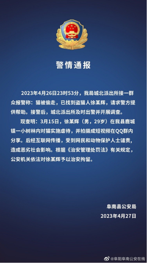 4月27日,阜南县公安局发布警情通报证实,经查明,3月15日,徐某辉(男,29岁)在阜南县鹿城镇一小树林内对猫实施虐待,并拍摄成短视频在QQ群内分享。后经互联网传播,受到网民和动物保护人士谴责,造成恶劣社会影响。根据治安管理处罚法有关规定,公安机关依法对徐某辉予以治安拘留。