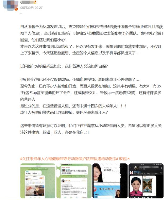 网传信息显示,张馨予、金星、赵露思等多位明星近日针对恶性虐猫事件发声,反对“处刑式虐待动物”,却因此被不法分子盯上,遭曝光身份证、手机号、社保卡等个人隐私信息。