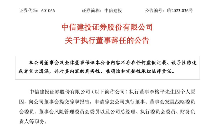6月1日晚间,中信建投发布公告称,公司执行董事李格平因个人原因,向公司董事会提交辞职报告,申请辞去公司执行董事、董事会发展战略委员会委员、董事会风险管理委员会委员以及公司总经理、执行委员会委员、财务负责人等职务。