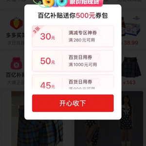 活动期间,消费者打开拼多多APP,进入百亿补贴频道,就可以看到百亿补贴大额券领取入口,点击“开心收下”即可领券。