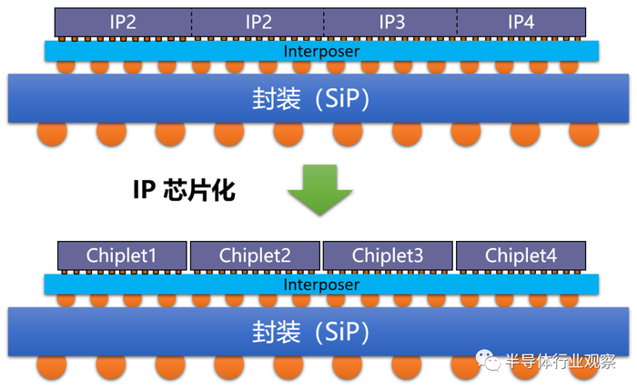 简单来讲,Chiplet旨在将大芯片“化整为零”,单颗Chip本质上是IP硬件化,Chiplet封装可以看作是多颗硬件化的IP的集成。后续Chiplet芯片的升级,可以选择仅升级部分IP单元对应的Chip,部分IP保留——从而实现一种新形式的IP复用,既可以借助生产规模获得更低成本,还能够大幅缩短产品上市周期。