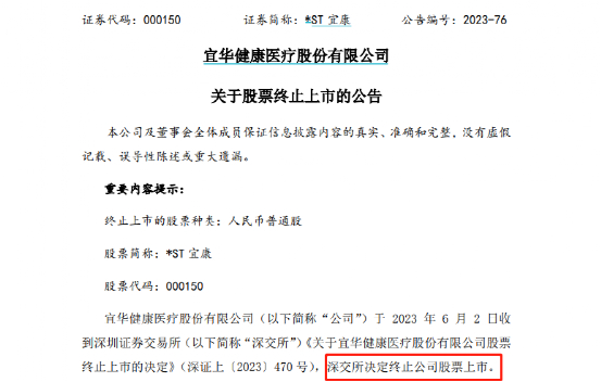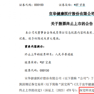 6月2日晚间,*ST宜康公告称,公司收到深交所《关于宜华健康医疗股份有限公司股票终止上市的决定》(深证上〔2023〕470号),深交所决定终止公司股票上市。