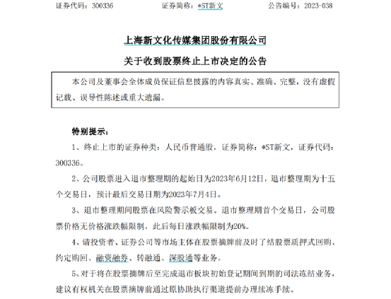 此外,*ST新文也发布公告称,公司收到股票终止上市决定。公司股票进入退市整理期的起始日为2023年6月12日,退市整理期为十五个交易日,预计最后交易日期为2023年7月4日。