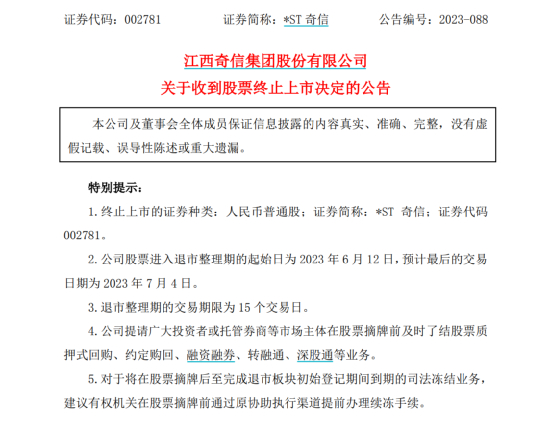 6月2日晚间,*ST奇信发布公告称,公司收到深圳证券交易所《关于江西奇信集团股份有限公司股票终止上市的决定》,深交所决定终止公司股票上市。公司股票进入退市整理期的起始日为2023年6月12日,预计最后的交易日期为2023年7月4日。