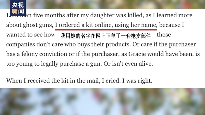 “幽灵枪”校园枪击案幸存者 米娅·特雷塔:当时我们正在谈笑,突然听见“砰”的一声枪响,当第二声枪声响起时我已经跌倒在地上。我爬起来,跑进教室里,同学和老师急忙为我止血,我被一名不认识的同校学生,同时也是一个未成年人,用一把点45口径的“幽灵枪”击中了。