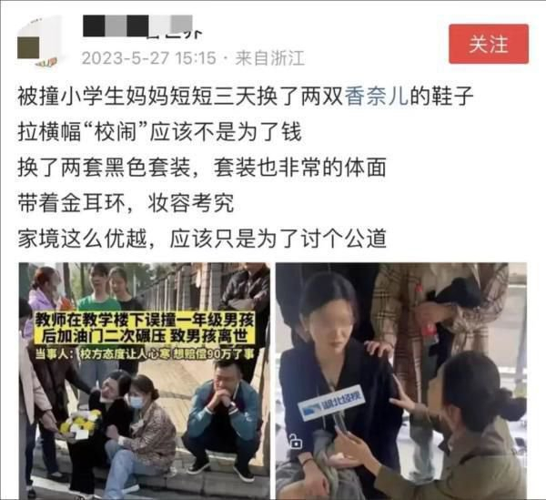 孩子妈妈在校门口痛哭等短短几个镜头,却因为她本身面容娇好、衣着得体,没有蓬头垢面,不符合一些人对死者家属的“想象”,就遭到了恶意满满的网民下流的“解读”:“化着精致妆容,像是特意打扮一番后才赶了过来”“这么冷静,一点都不像是亲生母亲”。